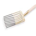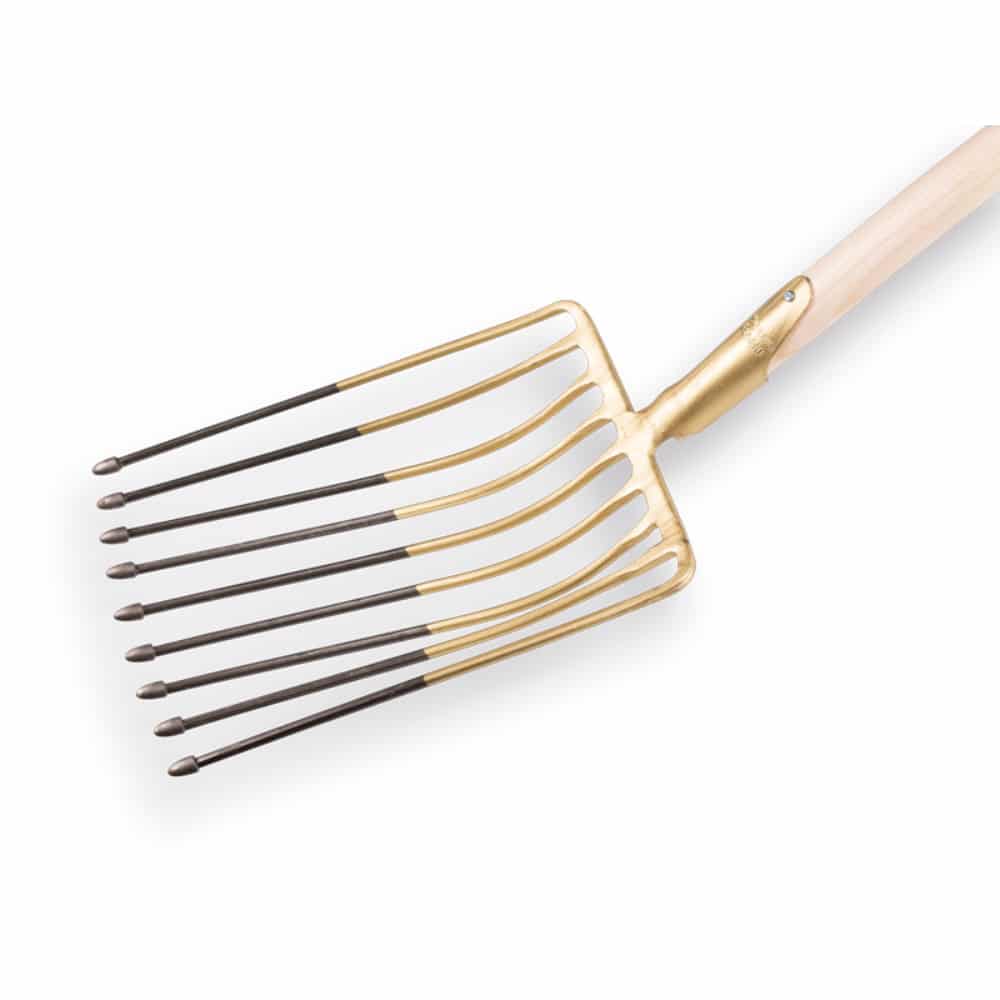 Het grote blad van de vork met 9 tanden diep en staat perfect op schep en is geschikt om kleine en grote aardappelen te scheppen.