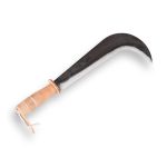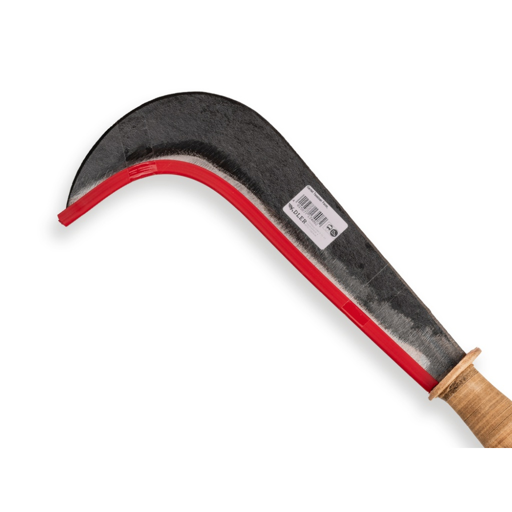 Zwitsers kapmes ADLER, ook wel gertel of machete genoemd, lengte 28cm, compleet met lederen handvat. Het sterke blad heeft een ronde gebogen vorm en een scherpe snijrand. Het kapmes wordt gebruikt voor verschillende snoei- en hakklussen, zoals het snijden van riet of gras, het kappen van twijgen of het verwijderen van dichte vegetatie.