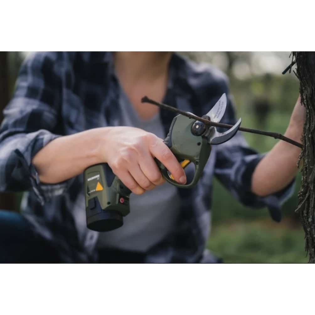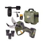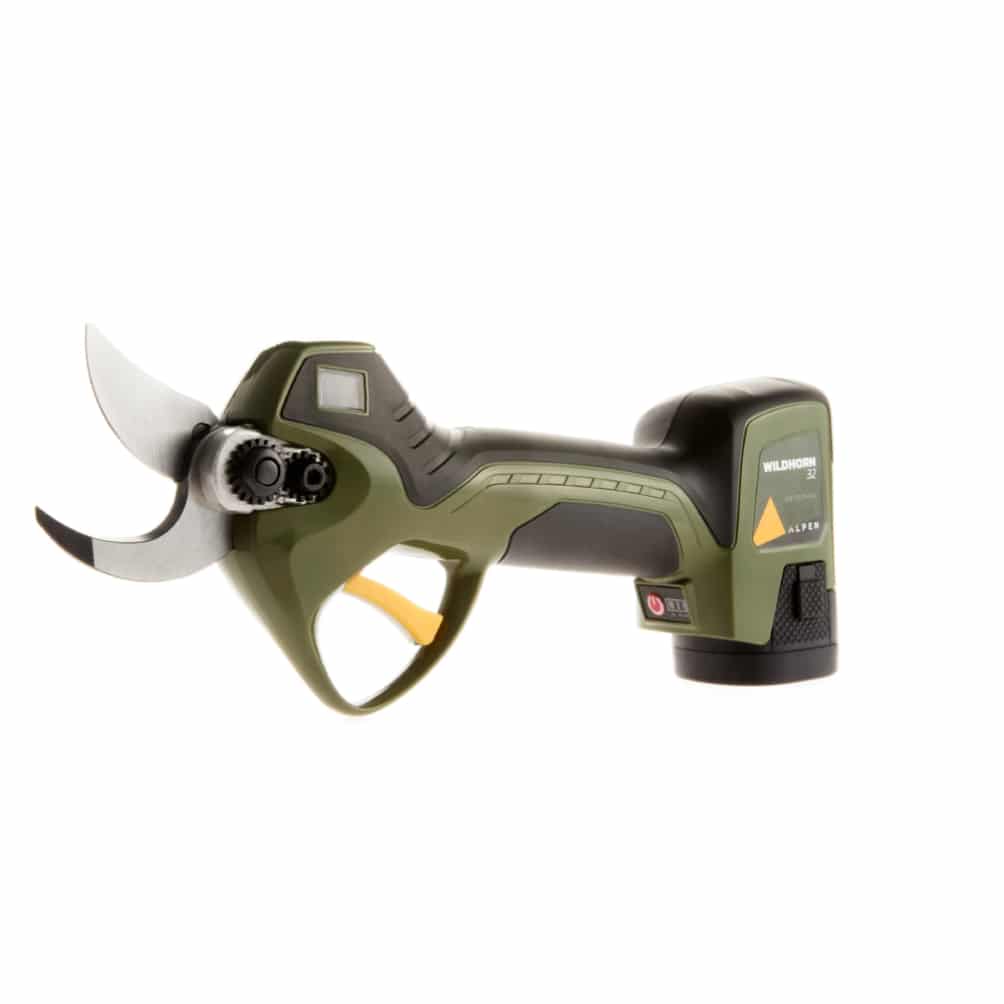De ALPEN Wildhorn32 snoeischaar is uitgerust met professionele FELCO snoeimessen van hooggelegeerd HSS-gereedschapstaal. Bij deze snoeischaar zit de accu in de achterkant van de snoeischaar. De accu levert de benodigde energie voor het knippen van takken tot 32 mm dik. Met de 3 bijgeleverde accu’s kun je een hele dag snoeien.