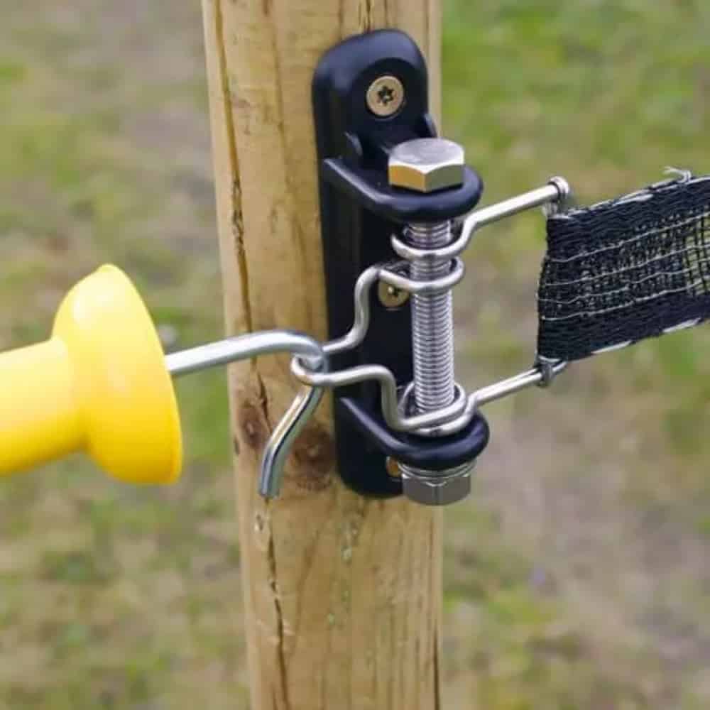 Lintisolator geschikt om te plaatsen bij doorgangen/ begin- eindpunten in een lintafrastering. Het lint kan opgespannen/vast kezet worden op de RVS/INOX beugels of met de lintgesp.