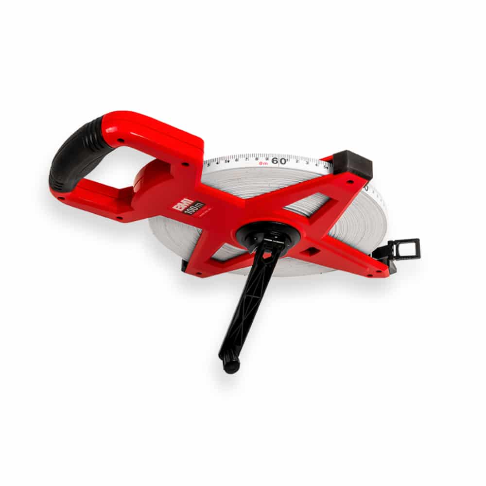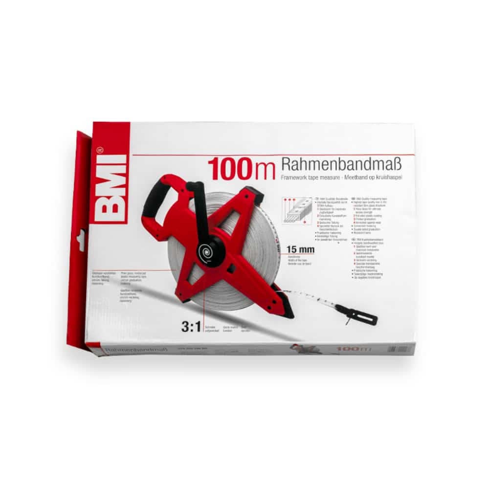BMI Kruishaspel glasvezel bandmaat 100m met markeerpunt. De kruishaspel, ook wel landmeter genoemd, heeft een bandbreedte van 13mm met cm / cm split.