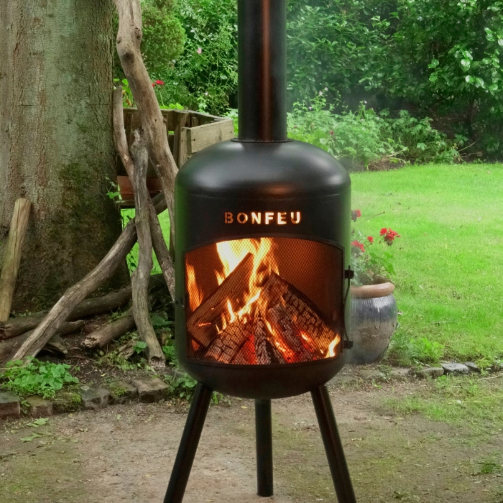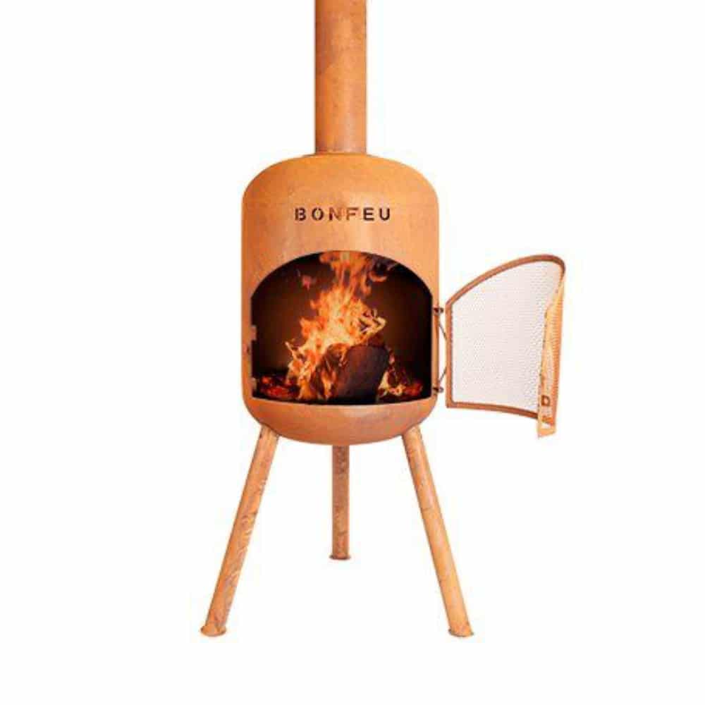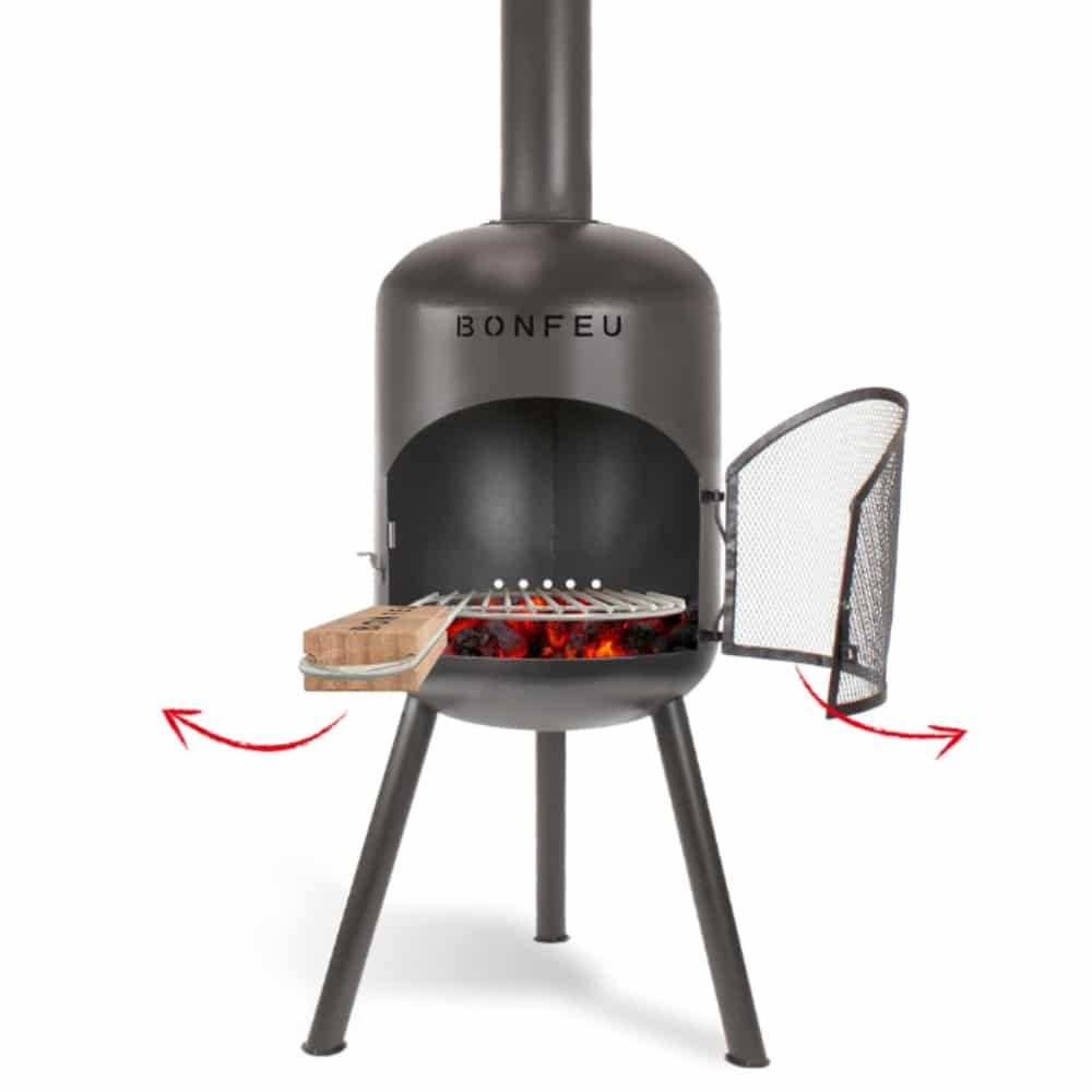 Een decoratief uitgesneden BonFeu-logo aan de voorkant zorgt ervoor dat de vlammen prachtig zichtbaar zijn, wat de sfeer ten goede komt. Het grillrooster is ook vernieuwd en nu in twee standen verstelbaar, en is voorzien van handvatten waardoor je het rooster gemakkelijk kunt verplaatsen en bedienen. Gebruik de BonFeu BonBono als barbecue De BonFeu BonBono Zwart wordt standaard geleverd met een roestvrijstalen grillrooster, veilig en geschikt voor het bereiden van voedsel. Met de handige handvatten draai je het rooster gemakkelijk in en uit de haard of haal je het eenvoudig uit de houder, zodat je na het grillen kunt genieten van het vuur. Duurzaam en gebruiksvriendelijk Deze BonFeu-BBQ terrashaard is ontworpen voor gebruik op terras of gazon en staat stabiel op drie stevige poten. De haard is gemaakt van staal met een zwarte hittebestendige coating. Door de hoge kachelpijp heeft de haard een goede rookafvoer, en de royale body zorgt voor een krachtige warmteafgifte die lang aanhoudt. Let op: De BonBono is gemaakt van staal met een hittebestendige lak, maar staal heeft de eigenschap om na verloop van tijd te gaan roesten. Dit geeft de haard een natuurlijke patina en heeft geen effect op de kwaliteit van de haard. De roestvorming kan zich al snel voordoen en is een normaal proces bij staal. BonFeu BonBono Tuinhaard in het kort: