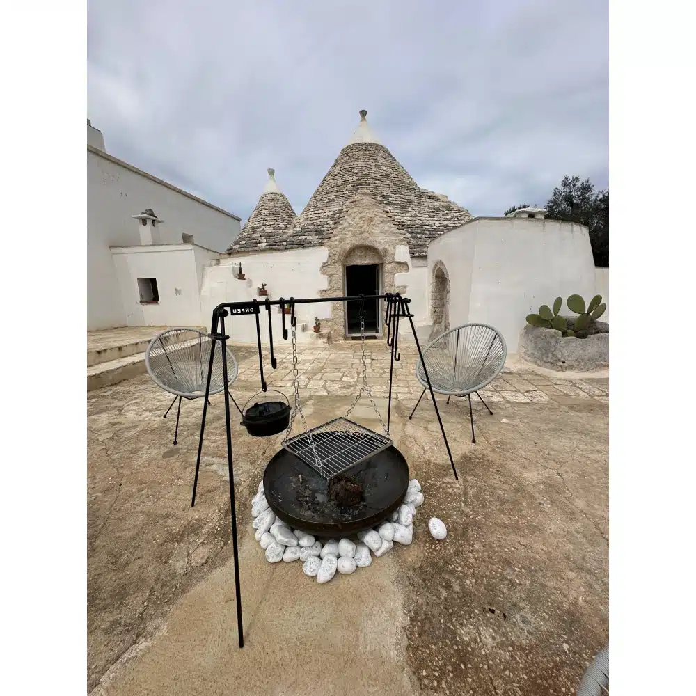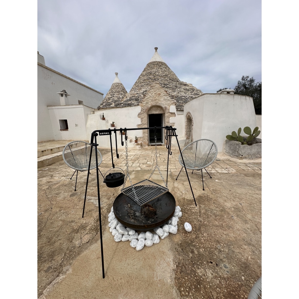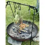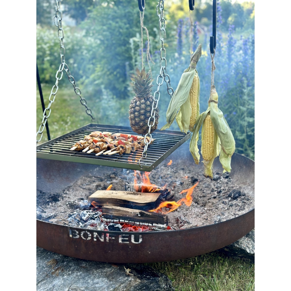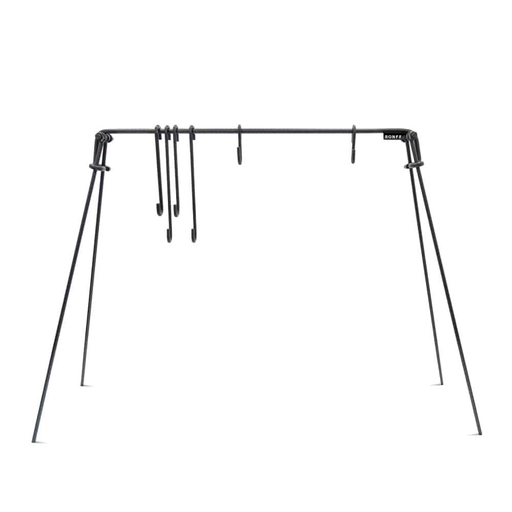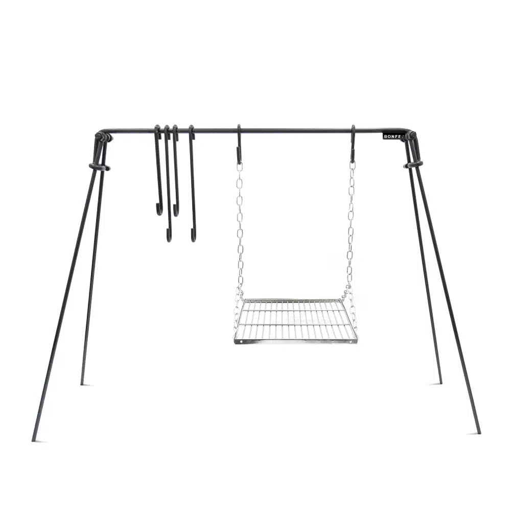 Met de BonFeu vuurbrug kun je kookpotten en grillroosters boven het vuur hangen, waardoor de warmte gelijkmatig wordt verdeeld en het voedsel niet aanbrandt. Zo kun je veilig en effectief buiten koken op open vuur.