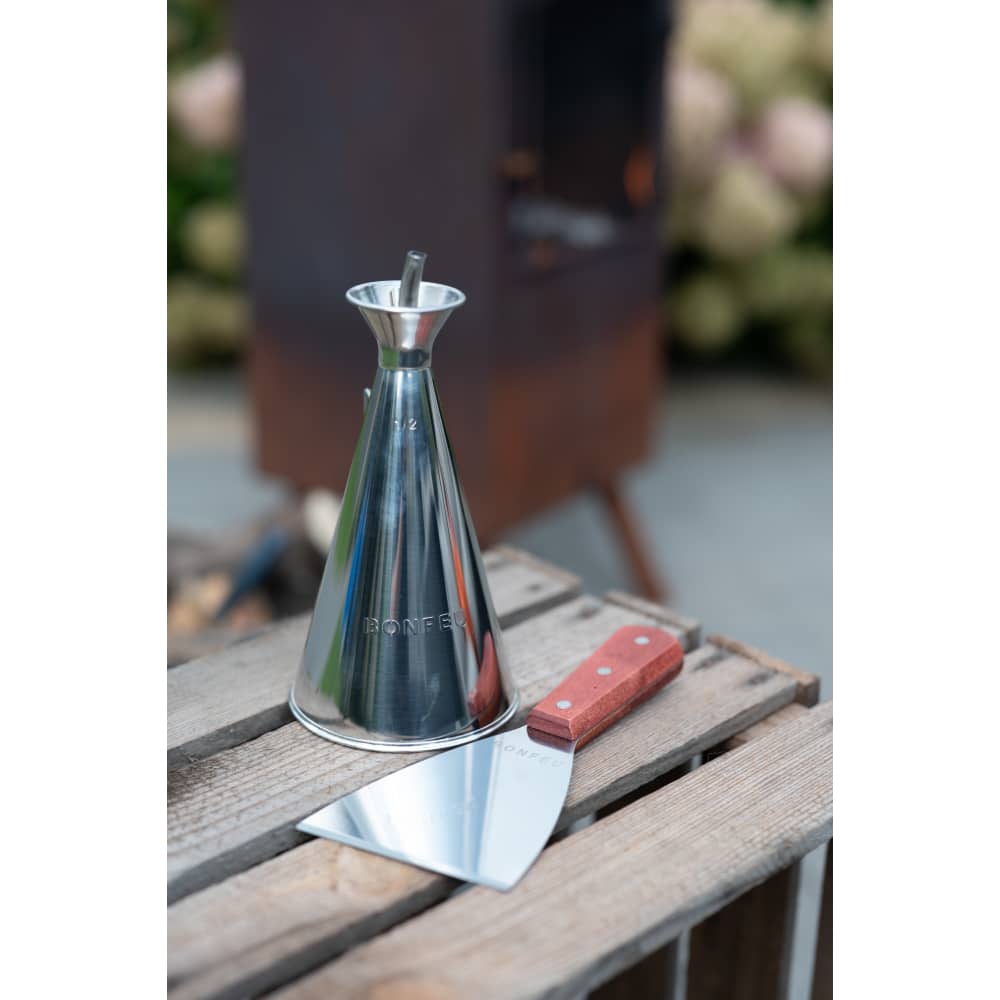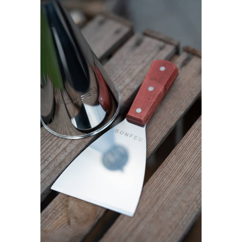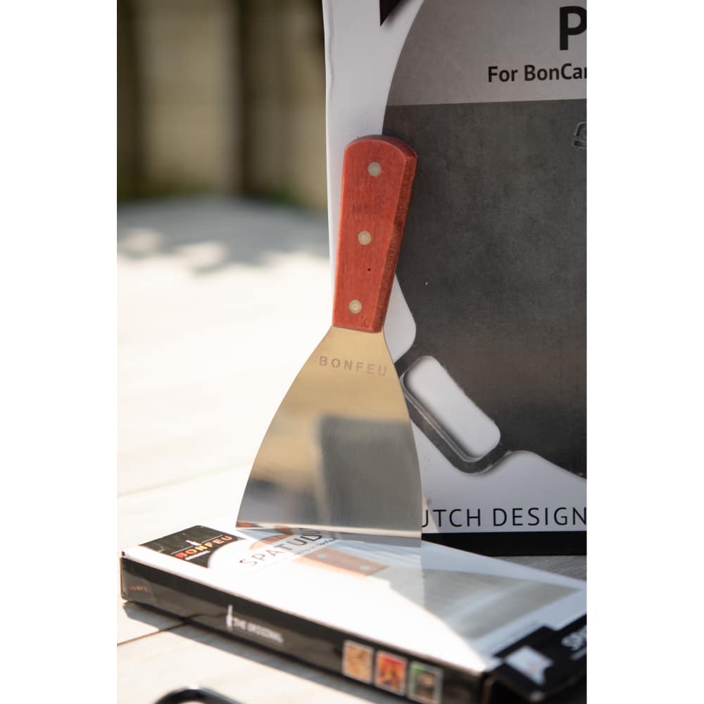 De BonFeu Spatel is een essentieel gereedschap voor buitenkoken en onmisbaar bij je BonFeu kookunit. Deze spatel heeft een houten handvat dat zorgt voor een stevige, comfortabele grip, en een roestvrijstalen blad met een scherpe rand waarmee je voedsel eenvoudig kunt losmaken en omdraaien op de kookplaat.