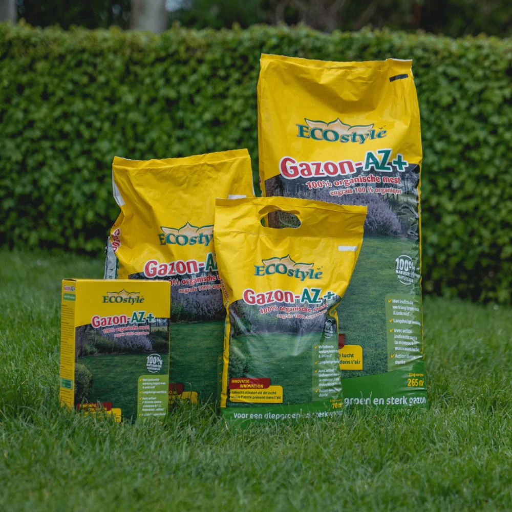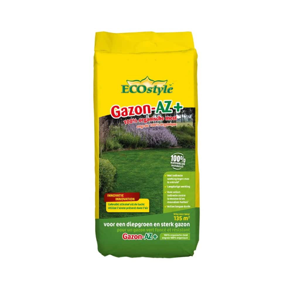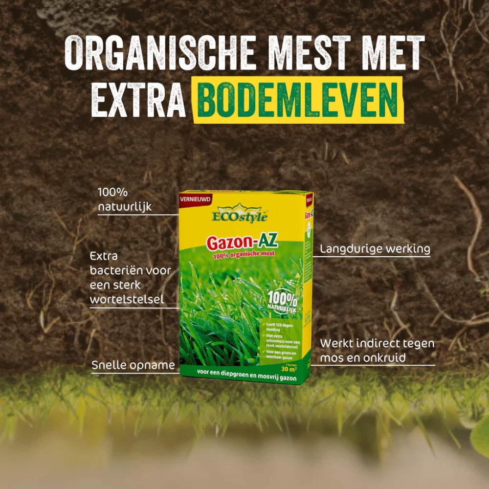 Wil je een groen en sterk gazon? Gras heeft voldoende voeding nodig. Kies altijd voor een organische meststof en niet voor kunstmest. Organische mest bestaat namelijk uit alleen natuurlijke elementen en bevat geen chemische stoffen. Een kunstmest lost op in water en spoelt dus weg bij een regenbui. Dit betekent dat kunstmest minder lang werkt, waardoor je veel vaker moet strooien. Wat maakt Gazon-AZ+ uniek? Gazon-AZ+ bevat stikstofbindende bacteriën die stikstof uit de lucht omzetten in voeding voor de plant. Dit zorgt voor een diepgroen en sterk gazon met indirecte werking tegen mos en onkruid. Daarnaast bevat Gazon-AZ+ gepatenteerde schimmels.