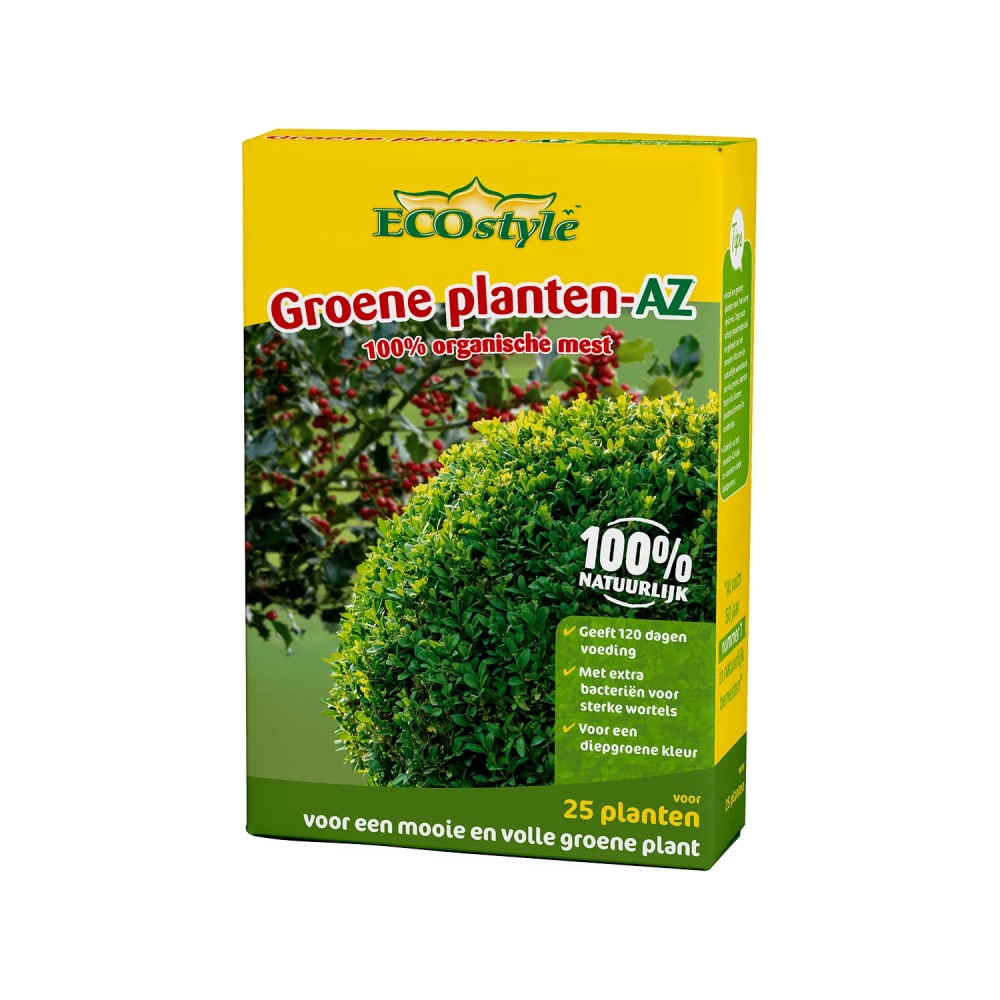Voor een gezonde, sterke planten is het belangrijk om regelmatig te bemesten. Zo wordt de plant minder vatbaar voor plagen en blijft het hele jaar mooi groen. Ook zal de plant beter groeien dankzij de extra voedingsstoffen. Wat maakt Groene planten-AZ uniek? Groene planten-AZ is verrijkt met micro-organismen die zorgen voor een gezond bodemleven en sterk wortelstelsel. ECOstyle meststof bevat o.a. gepatenteerde schimmels: