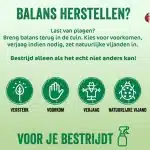 Schade aan je plant? Plagen zoals bladluis zuigen sap uit planten, waardoor die minder vocht en voedingsstoffen krijgen. Hierdoor groeit je plant niet goed. De bladeren krullen om en er ontstaan gele vlekjes op het blad. Uiteindelijk kan de plant zelfs dood gaan. LuisVrij is een makkelijke én effectieve manier om van bladluis, trips en witte vlieg af te komen. Het middel is zowel binnen als buiten toe te passen. De werkzame stof in LuisVrij is kaliumzout van vetzuur, een zeepachtige stof wat in de bodem razendsnel afbreekt door het aanwezige bodemleven. LuisVrij combineren met mest De aangevreten bladeren zullen niet meer herstellen. Gebruik een organische meststof om te zorgen dat de plant weerbaar is en snel weer nieuwe bladeren gaat groeien.