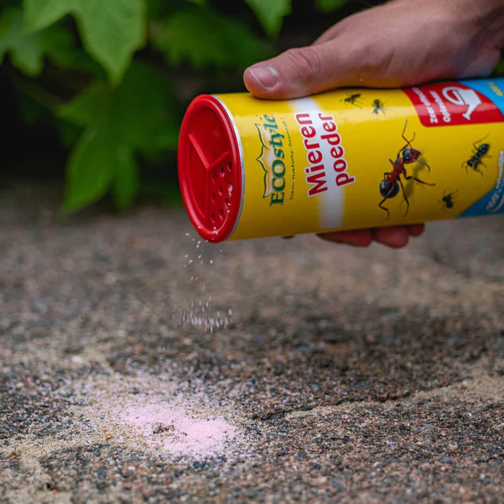 • Strooien: Strooi het poeder bij de ingang en rondom het mierennest. Gebruik 40 gram per vierkante meter.