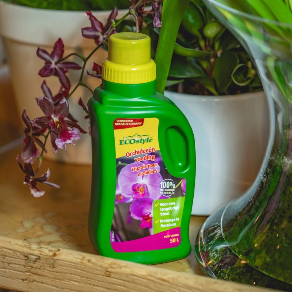 100% natuurlijke orchideeën voeding Orchideeën hebben de juiste voedingstoffen nodig om goed te kunnen groeien en bloeien. Het geven van 100% organische Orchideeën voeding van ECOstyle zorgt voor een langdurige en uitbundige bloei van de plant. Orchideeën voeding verhoogt tevens de weerstand en geeft de bloem een intense kleur. Het heeft een onbeperkte houdbaarheid en zit in een handige schenkflacon. De vloeibare Orchideeën Plantenvoeding bevat specifiek op deze omvangrijke plantengroep afgestemde voedingsstoffen, mineralen en sporenelementen. Voor de rijkste bloei van jouw orchidee Orchideeën zijn de laatste jaren enorm populair geworden. Je ziet ze als losse plant in potten, maar ook in bloemstukken komen ze goed tot hun recht. Wil jij ook uitbundig bloeiende orchideeën? Geef ze dan Orchideeën plantenvoeding van ECOstyle.