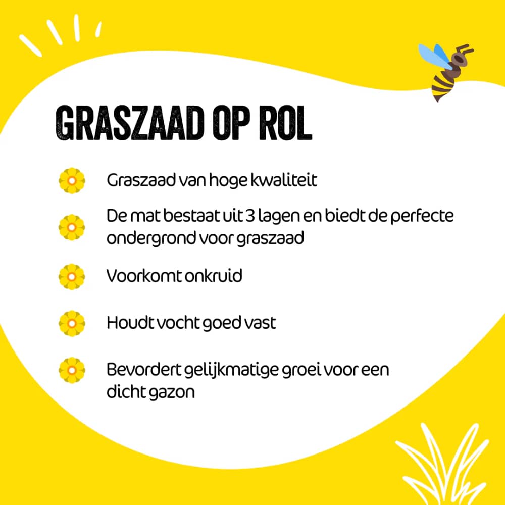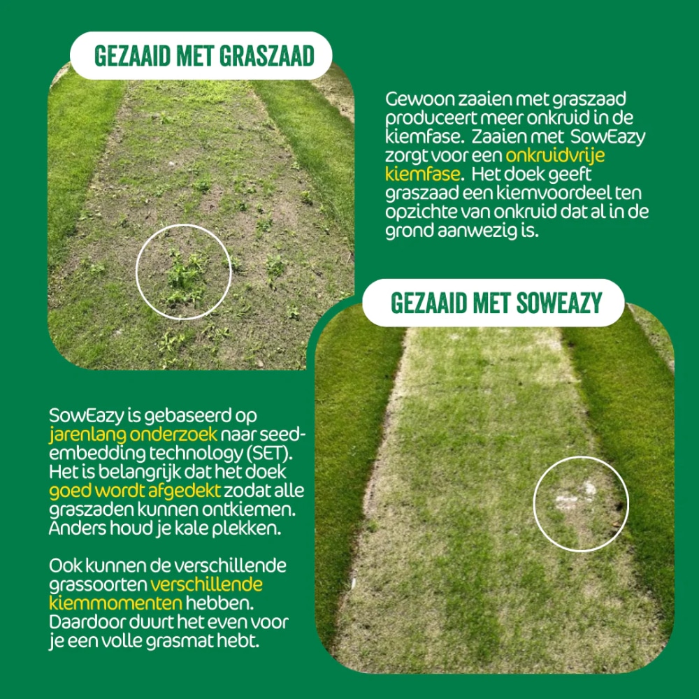 Wat is de SowEazy inzaai graszaad op rol? Deze SowEazy graszaad inzaairol bevat een mix van verschillende soorten graszaden die zorgen voor een fijn en sterk gazon.  De mix bevat twee types Engels raaigras voor een snelle dichte groei. Verder zit er veldbeemd in dat zorgt voor een sterk wortelstelsel. Tenslotte bevat de mix verschillende types roodzwenk die zowel op zand- als kleigrond groeit en goed tegen schaduw kan. De zadenmix is optimaal op de rol geplaatst waardoor je na verloop van tijd een gelijkmatige grasmat krijgt. De rol bestaat uit drie lagen: een coating, de zaden en de biologisch afbreekbare mat. De mat kan goed vocht vasthouden, onderdrukt onkruidgroei en lost uiteindelijk op in de bodem. De graszaadhulzen en afbreekbare mat zijn onwijs waardevolle bronnen van voeding voor het bodemleven. Waarom  SowEazy graszaad inzaairol? Graszaad op rol is een eenvoudig alternatief voor het leggen van graszoden of strooien van graszaad. Geschikt voor alle types gazon, ook in de schaduw. De graszaden in de mat zijn optimaal geplaatst zodat je een mooi, dicht gazon krijgt. De speciale coating zorgt voor een optimale, gelijkmatige ontkieming. Doordat de graszaden in de mat vastzitten, heb je geen last van het wegwaaien van de zaden, wegspoelen van de zaden door regen of wegpikken van de zaden door vogels. Dit zorgt voor een optimaal resultaat.