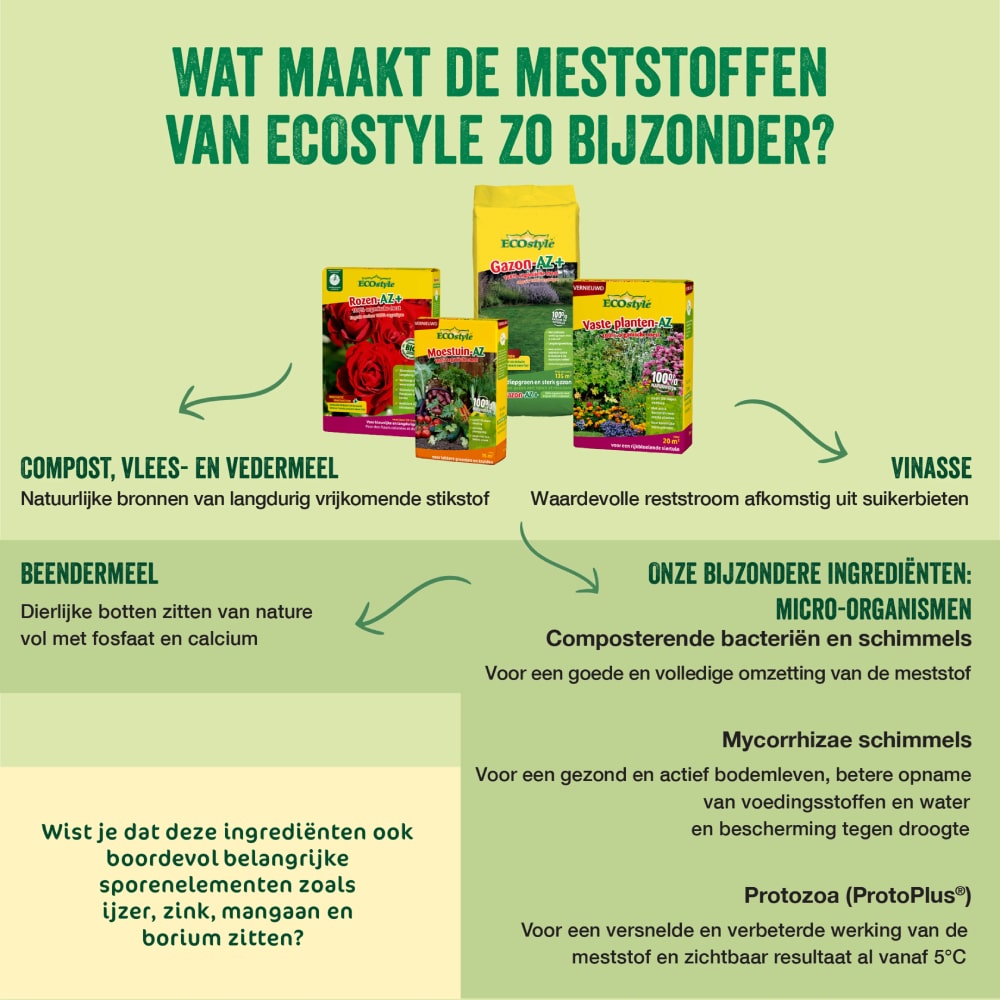 Voor een weerbare, bloeiende tuin is het belangrijk om regelmatig te bemesten. Zo worden je planten minder vatbaar voor plagen en behouden langer hun mooie kleur. Ook zullen je vaste planten beter groeien dankzij de extra voedingsstoffen. Wat maakt Vaste planten-AZ uniek? Vaste planten-AZ is verrijkt met micro-organismen die zorgen voor een gezond bodemleven en sterk wortelstelsel. ECOstyle meststof bevat o.a. gepatenteerde schimmels: