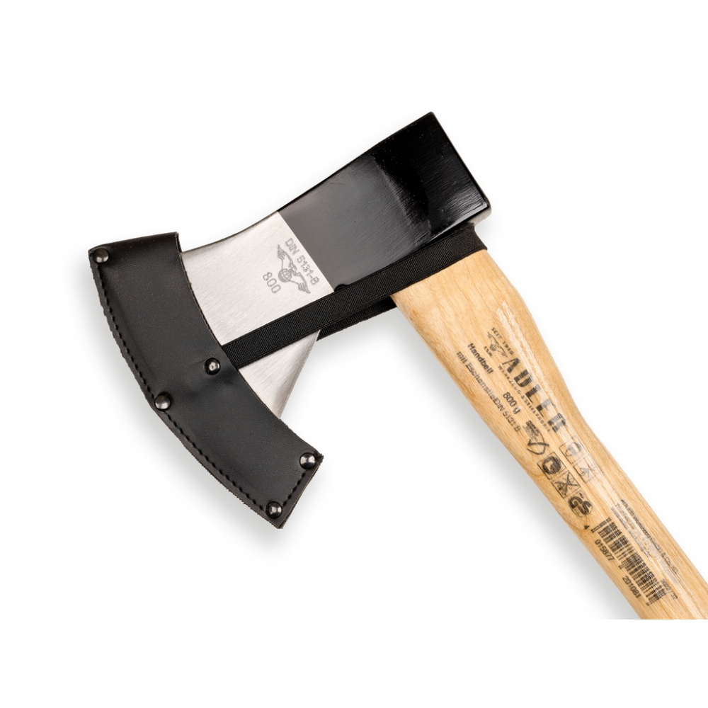 Productomschrijving Handbijl, keukenbijl 800 gram met Essen steel 38 cm. Deze handbijl is ideaal voor het kleinere handwerk. De bijl heeft een gehard stalen kop met een gepolijste scherpe snijrand. Hiermee hak je eenvoudig houten blokken of takken en wordt geleverd met een beschermhoes. Merk ADLER. Meest gebruikt.