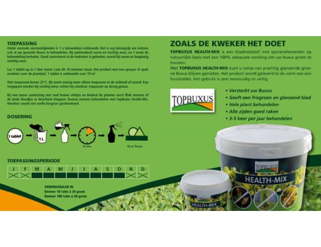 TopBuxus Health Mix is een natuurlijke bladmeststof voor het herstellen van aangetaste buxussen. Bevat koper, zwavel, stikstof en magnesium. Ook te gebruiken ter voorkoming van de bekende buxusschimmels. Gebruik 1 tablet per liter water voor 10m2.