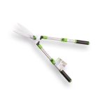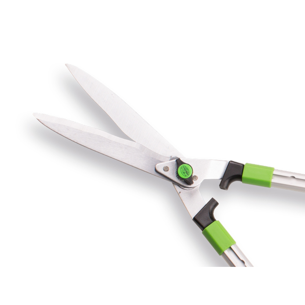 Lichte heggenschaar met opgeklonken golfsnede messen. Hardverchroomd met aluminium buizen voorzien van aanslagdempers. Instelbare moerborging. Tegen kou geïsoleerde telescoophandgrepen met 4 standen.