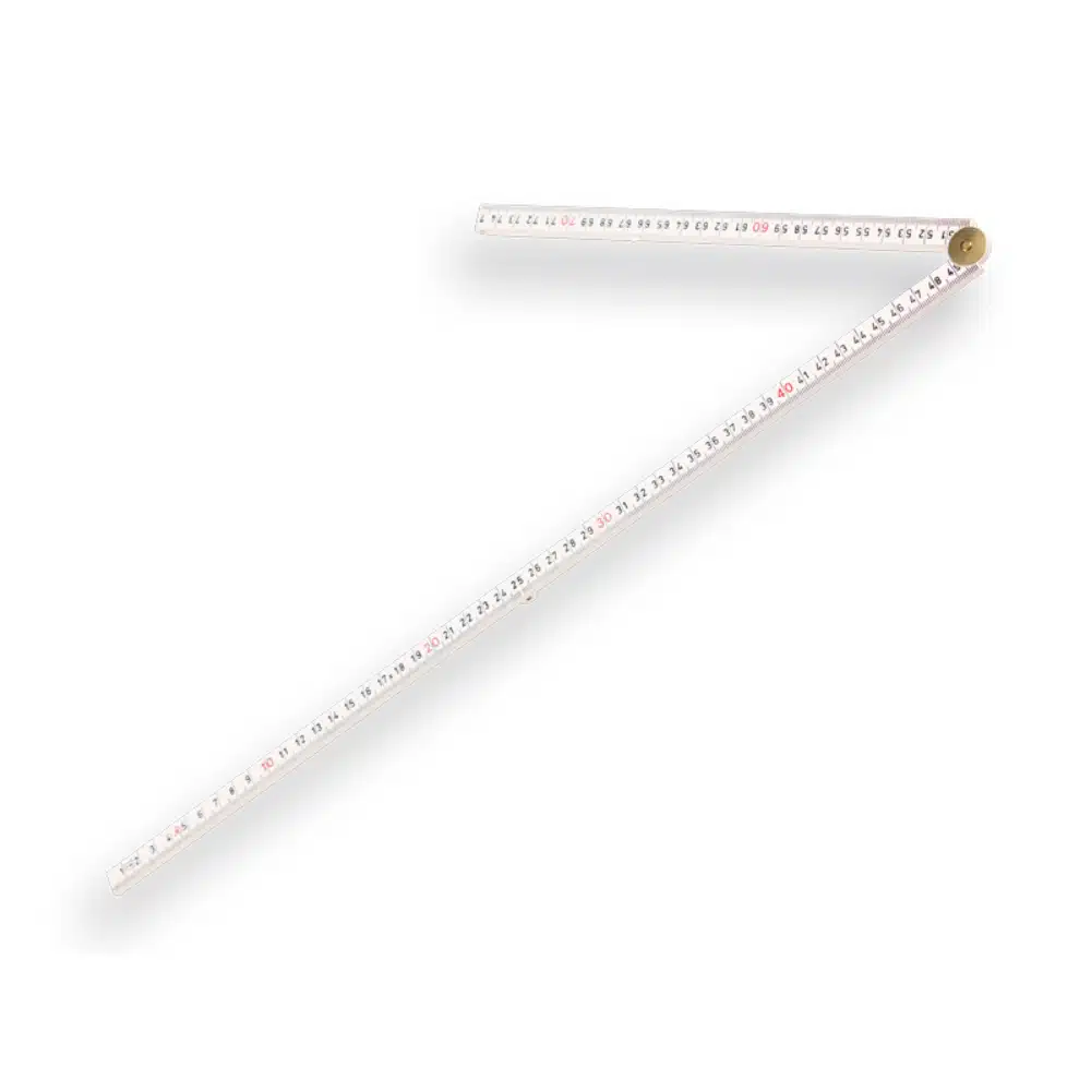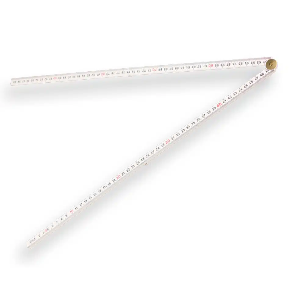 Duimstok 1 meter glasfiber wit. Duimstok (vier delig) van glasfiber, voorzien van zwart/rode opdruk/maatindeling. Met geharde stalen veren. Zeer flexibel. Bestand tegen olie, vet etcetera. Breedte: 22mm. Deze duimstok wordt veel gebruikt in het buitenwerk en in de bouw.