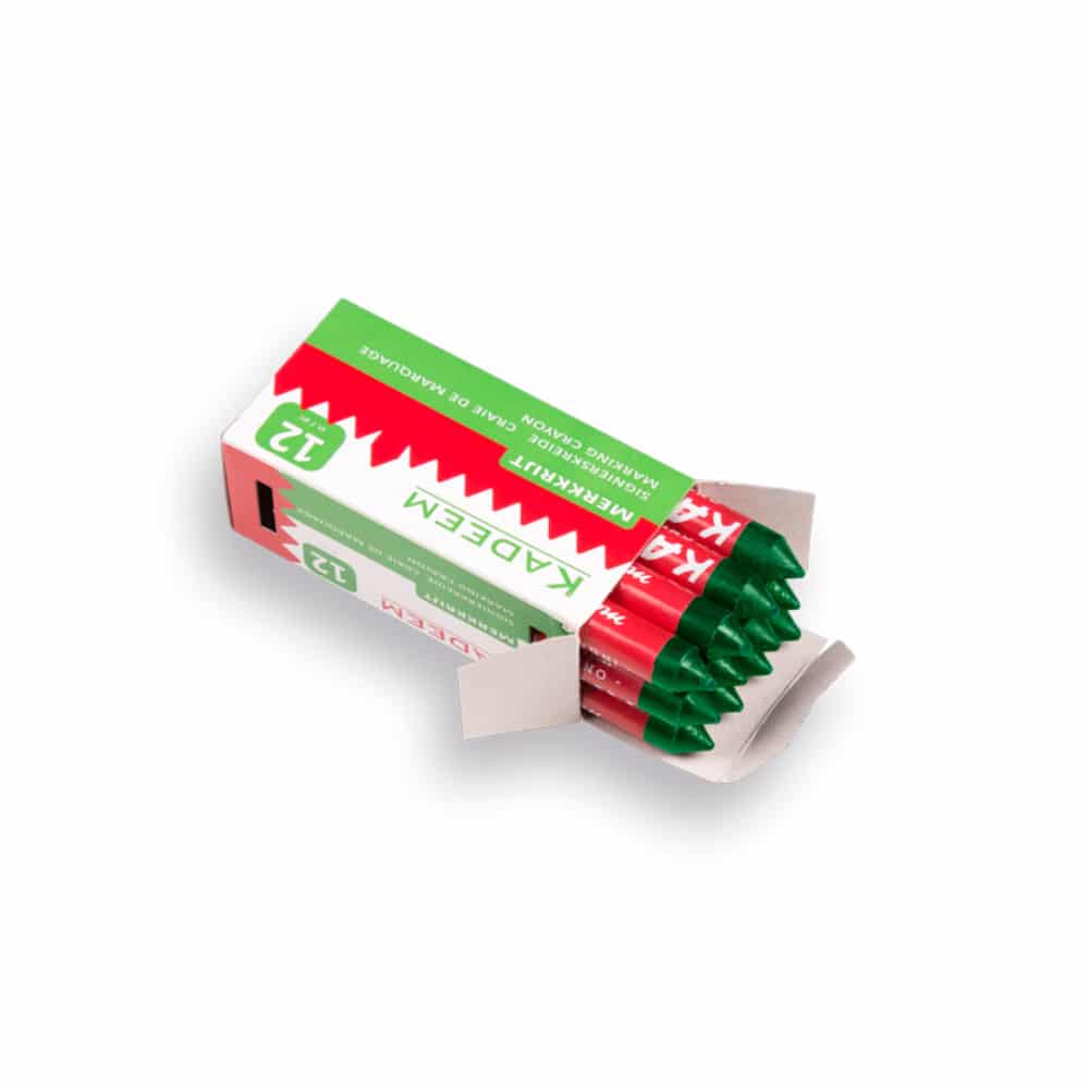 Kadeem merkkrijt - waskrijt GROEN, diameter 13 mm, verpakt per 12 in een doosje. De waskrijt is niet uitwasbaar. Multifunctioneel en onuitwisbaar krijt voor het markeren en het zetten van lijnen.