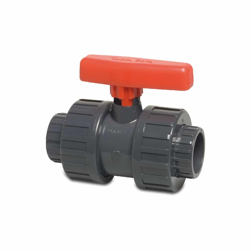 De PVC-U Profec Kogelkraan met dubbele wartel, type Safe 600 heeft een lijmmof verbinding en een maximale werkdruk van 16 bar.