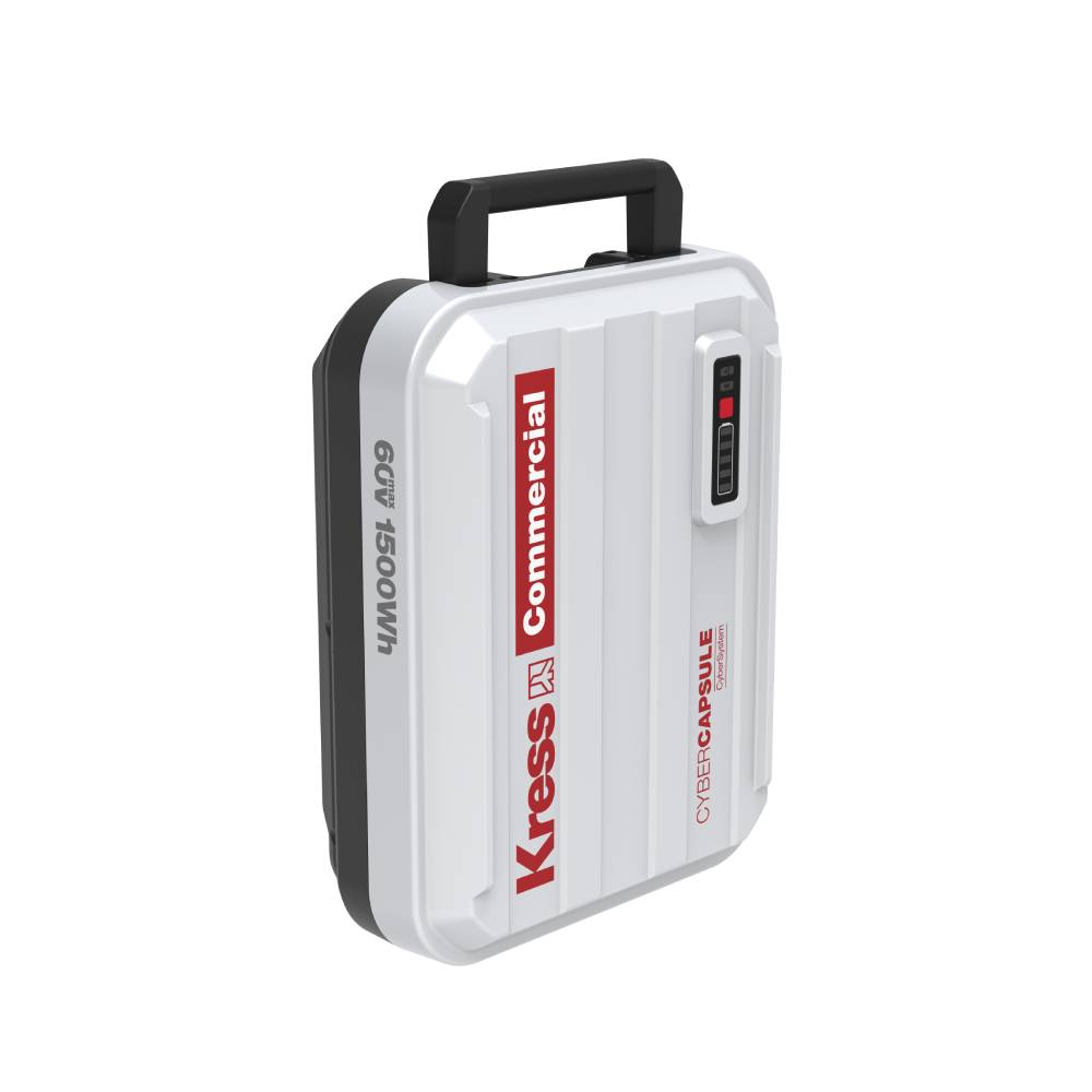 De Kress CyberCapsule is een compacte en flexibele energieopslagmodule van 1,5 kWh voor het opladen van accu's wanneer stopcontacten niet toegankelijk zijn. Deze module biedt hoveniers de flexibiliteit om hun energiecapaciteit aan te passen aan de dagelijkse behoefte door extra CyberCapsules mee te nemen. De CyberCapsule kan ook als rugzakaccu worden gebruikt om gereedschap direct van stroom te voorzien.