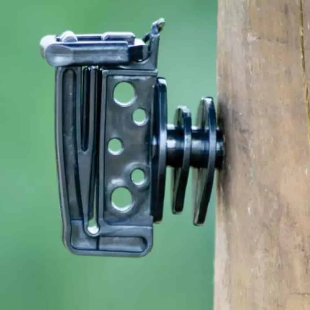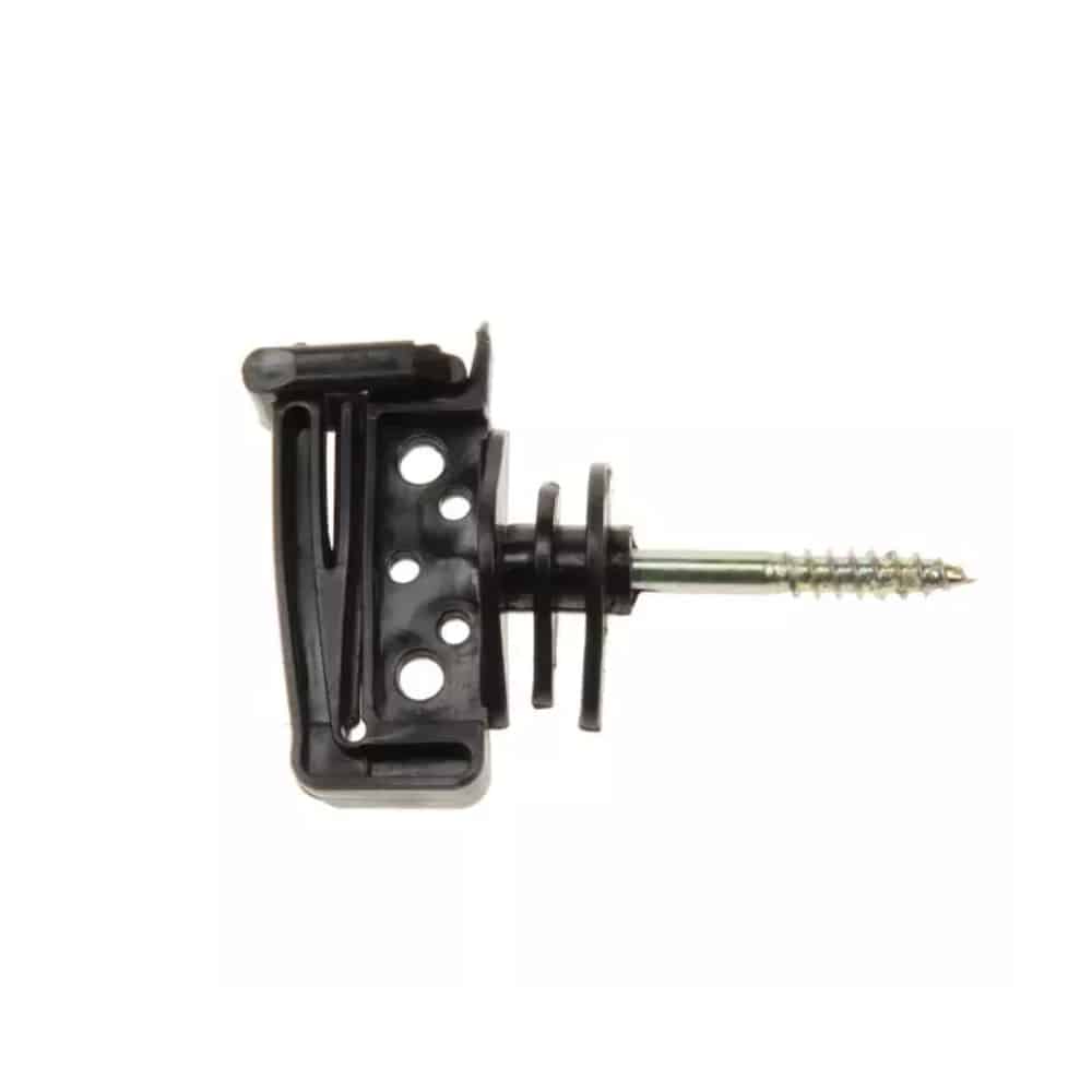 Lintisolator voor op de tussenpalen, deze isolator heeft 2 aparte sleufen voor max 20mm en max 40mm lint, de stift van deze indraai-isolator is voorzien van een scherpe punt en boorsleuf, dit vergemakkelijkt het indraaien. Doormiddel van een bijpassende metalen schroefhulp (niet mee geleverd) is deze isolator met de accuschroefmachine snel en eenvoudig te monteren.