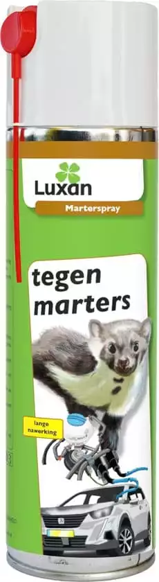 Luxan Marterspray voorkomt schade door marters aan bekabeling, leidingen, isolatie in de auto en in en rond uw woning. Marters zullen de behandelde ondergrond mijden, dankzij de gevormde kleverige beschermlaag. De transparante en geurloze spray biedt langdurige bescherming en is bestand tegen weersinvloeden, zwakke zuren en basen. De spuitbus is 360° draaibaar waardoor alle plaatsen goed bereikt kunnen worden tijdens het sprayen. Marterspray kan ook aangebracht worden op bewegende onderdelen.