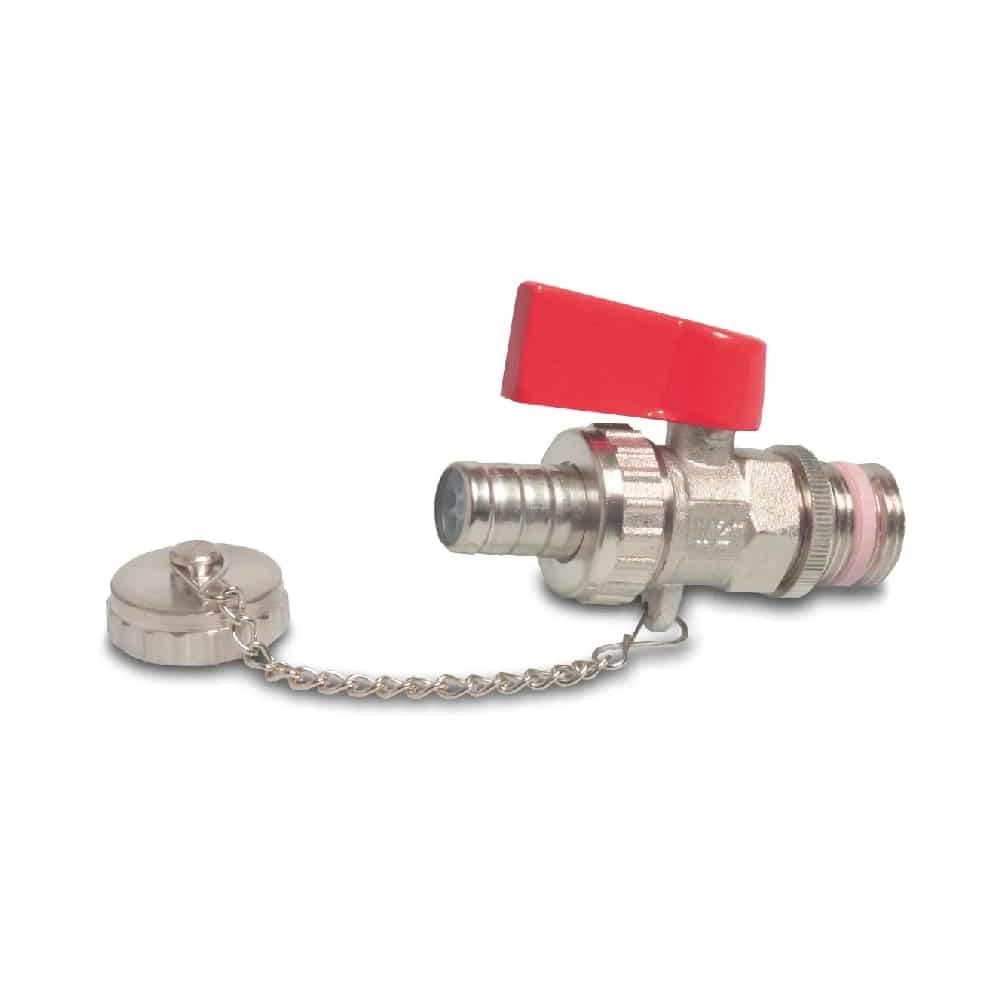 Messing vul- en aftapkraan met 12mm slangtule. Zelfsluitend.
