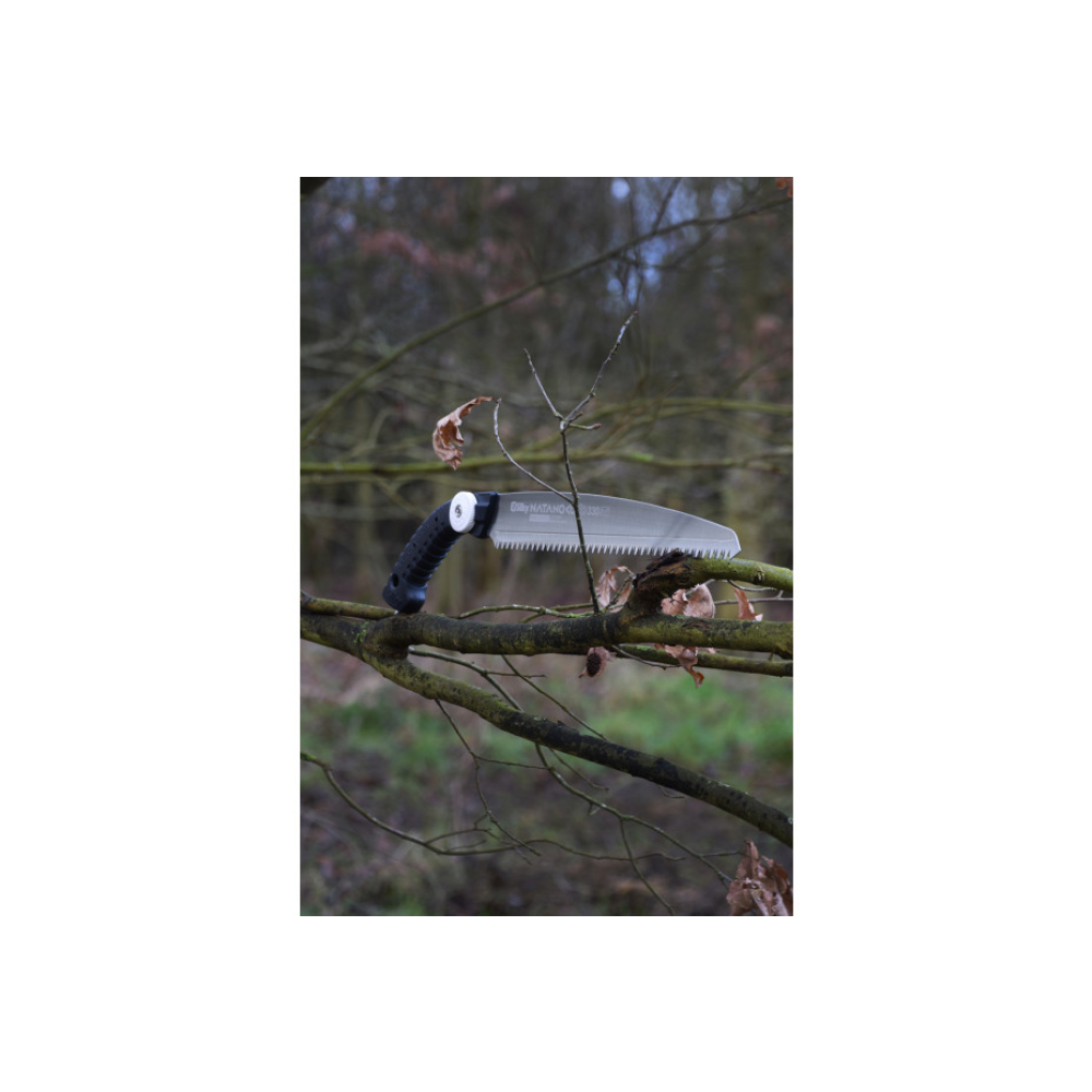 De Natanoko 60 is de grotere en sterkere broer van de Gomtaro. Door de hoge rug is deze trekzaag nog stabieler en worden trillingen nog beter opgevangen. Het sterke zaagblad heeft een hoge stijfheid en een grove vertanding van 7.5 tanden per 30 mm. Daarmee zaag je moeiteloos en snel dikke stammen door. De grote, rubberen handgreep absorbeert trillingen, geeft grip en voelt comfortabel aan. Het blad is in slechts enkele seconden te vervangen dankzij de draaiknop op de handgreep. Er komt dus geen enkel gereedschap aan te pas. De holster is zo ontworpen dat de zaag er in geen mogelijkheid uit valt, zelfs niet als je tijdens het klimmen in moeilijke posities verkeert. Zodra je de zaag nodig hebt, dan trek je deze er gemakkelijk met één hand uit door je duim af te zetten tegen de knop aan de zijkant. Vergeet niet om leg straps mee te bestellen zodat je de Natanoko altijd binnen handbereik hebt. De naam Natonoko is een samenvoeging van het Japanse woord voor bijl (nata) en handzaag (noko). Alle zagen uit de Natanoko serie zijn voorzien van een lichtgewicht, polypropyleen holster met afneembare riemhouder. De holster heeft 2 rolletjes die voorkomen dat de scherpe tanden de hoes beschadigen. De onderkant is voorzien van een grote opening die vocht en zaagsel afvoert. Het zaagblad moet schoon gehouden worden, anders gaat de zaagwerking verloren. Hars lost op in olijfolie en dit is dan ook een effectieve, milieuvriendelijke manier om het blad te reinigen. Agressievere middelen kunnen het rubber van de handgreep aantasten. Wanneer je de zaag niet gebruikt, maak deze dan goed droog. Bewaar de zaag in de holster op een droge plaats.