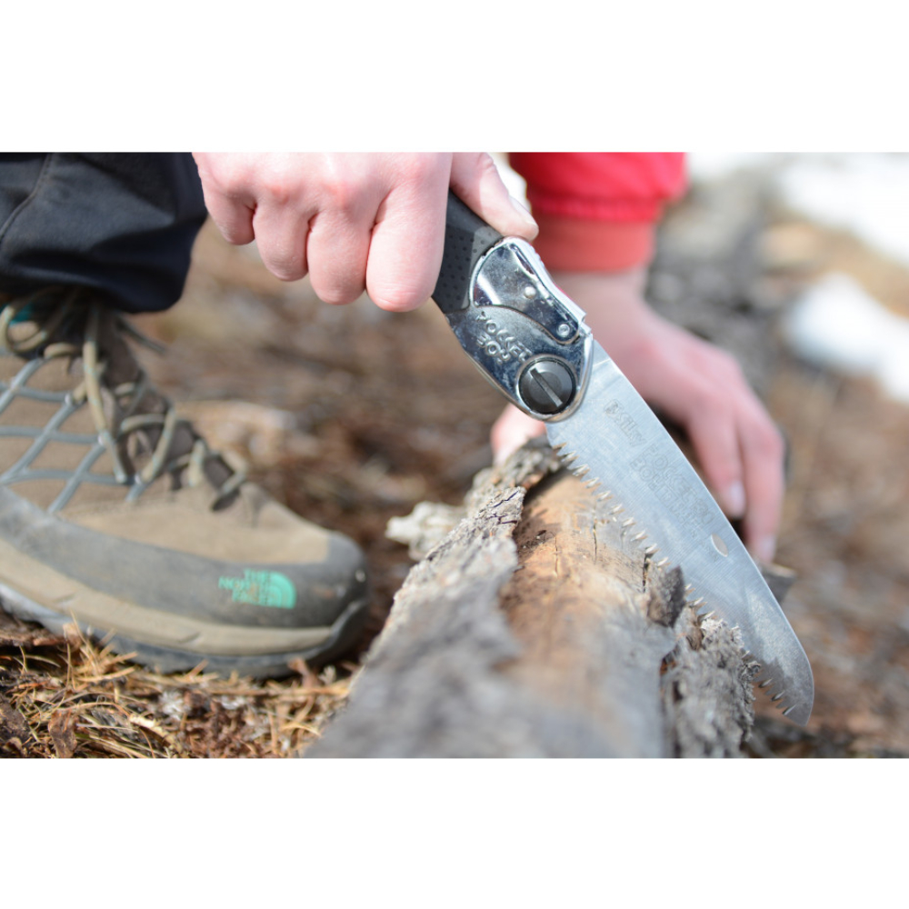 De Pocketboy is licht van gewicht en perfect gebalanceerd. Het zagen verloopt bijzonder soepel en je bent in staat om in de meest dichtbegroeide ruimtes te werken. Snoeien is nog nooit zo’n leuke klus geweest! Mocht je nog niet gewend zijn aan het zagen met een Silky trekzaag, dan ben je gewaarschuwd voor de vlijmscherpe tanden die zich razendsnel door het hout werken. Zelfs na veelvuldig gebruik blijven de tanden lang scherp zodat je keer op keer een gladde en zuivere zaagwond achter laat die goed kan herstellen. Als je de Pocketboy niet gebruikt, dan is het blad gemakkelijk in te vouwen met de vergrendelknop. De scherpe tanden worden dan veilig bedekt doordat ze volledig in de handgreep vallen. Wanneer je de zaag nodig hebt, dan vouw je deze gemakkelijk uit dankzij de inkeping in het blad, zelfs bij het dragen van handschoenen. Met de vergrendelknop kun je het blad veilig vergrendelen in twee verschillende posities. De rubberen handgreep absorbeert trillingen en biedt een uitstekende grip. De Pocketboy ligt stevig en comfortabel in de hand, zelfs na langdurig gebruik. De uitsparing in de handgreep biedt de mogelijkheid om een karabijnhaak of koord aan de zaag te bevestigen. Je kunt de Pocketboy aan je riem dragen in de transparante hardcase die wordt meegeleverd of kies voor een bijpassende rubberen hoes. Ook handig: je kunt deze compacte vouwzaag gewoon in een gereedschapskist opbergen. De buitengewone zaagcapaciteit van de Pocketboy heeft deze zaag de bijnaam “Little Giant” opgeleverd. De bladen zijn onderling uitwisselbaar. Je kunt de schroef eenvoudig losdraaien zonder gebruik van gereedschap. Zo heb je één zaag voor verschillende doeleinden. De Pocketboy wordt standaard geleverd in een transparante hardcase met riemhouder. Het zaagblad moet schoon gehouden worden, anders gaat de zaagwerking verloren. Hars lost op in olijfolie en dit is dan ook een effectieve, milieuvriendelijke manier om het blad te reinigen. Agressievere middelen kunnen het rubber van de handgreep aantasten. Wanneer je de zaag niet gebruikt, maak deze dan goed droog. Bewaar de zaag op een droge plaats, bij voorkeur in de hardcase of een daarvoor bestemde hoes.