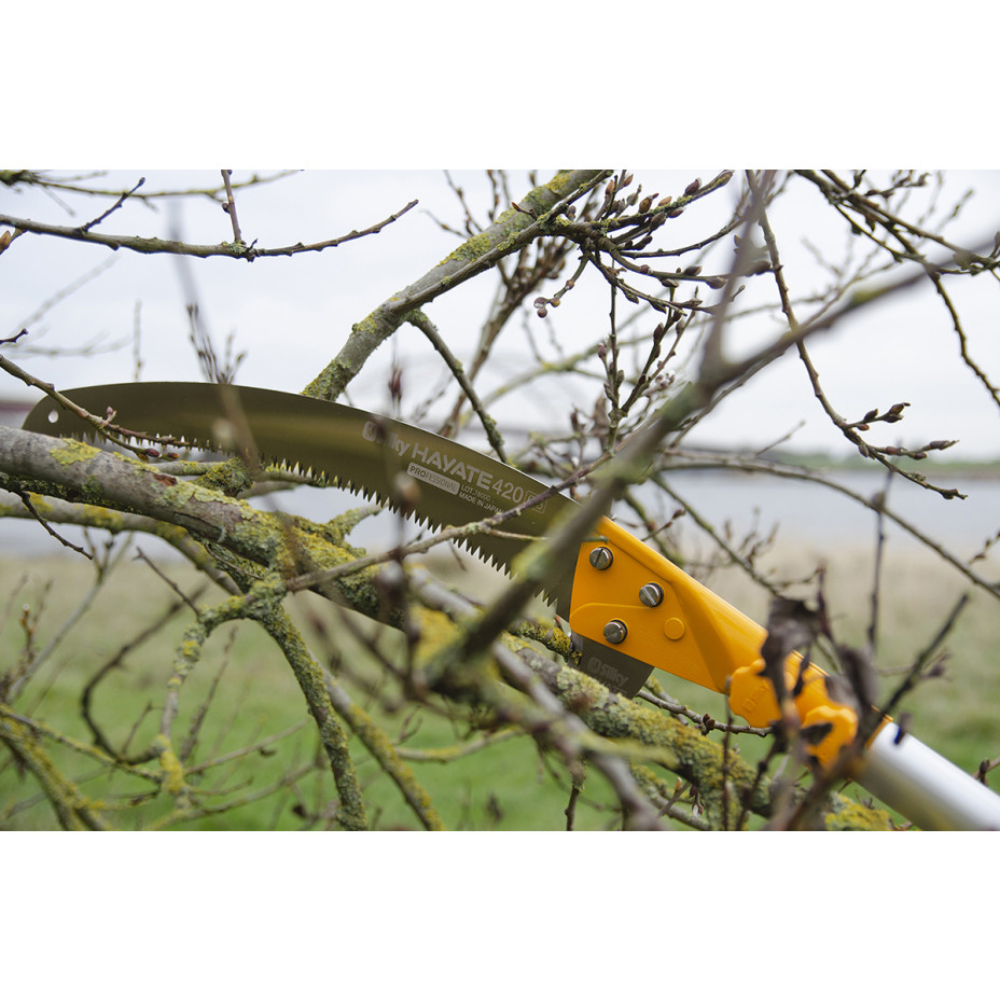 Een echte heavy duty tool speciaal voor professionals. De Hayate heeft een zwaardere constructie dan de Hayauchi, wat deze telescopische stokzaag nóg robuuster maakt. En ja, de Hayate is daarom ook wat zwaarder, maar nog steeds goed hanteerbaar. Het blad met Silky’s unieke Mirai-Me vertanding bestaat uit een speciale metaallegering, wat het blad duurzaam en enorm sterk maakt.