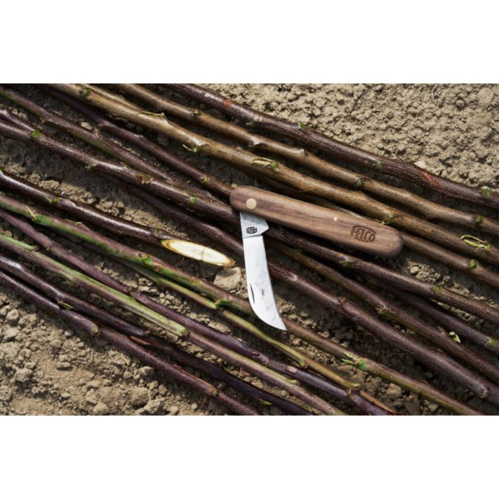 FELCO 511 is een eersteklas professioneel entmes dat ongeëvenaarde precisie biedt voor vlekkeloos enten op wijnstokken en fruitbomen. Het gebogen lemmet van hoogwaardig koolstofstaal is gemaakt van de beste materialen en is aan één kant geslepen voor een perfect rechte en regelmatige snede. Handgrepen van walnotenhout zorgen voor een ongeëvenaard comfort. De messing binnenkant voorkomt wrijving en beschermt het blad tegen beschadiging. Voordelen van het product