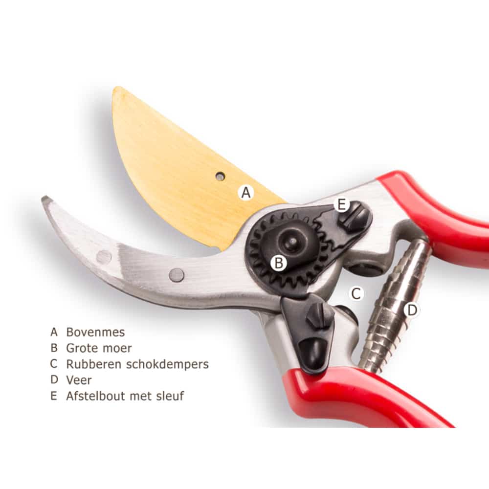 Productomschrijving Het boven- en ondermes zijn gemaakt van hoge kwaliteit SK3 Japans staal. Het bovenmes heeft daar overheen nog een extra titanium coating voor langdurige scherpheid. De tandmoer zorgt voor een eenvoudige, nauwkeurige afstelling van het boven- en ondermes. Dit resulteert in een perfect gladde wond waardoor herstel snel mogelijk is. De gesmede handgrepen van geanodiseerd aluminium zorgen voor kracht en duurzaamheid. De snijcapaciteit van de snoeischaar is 25 mm. De snoeischaar heeft twee openingsstanden, een stand voor grote en een stand kleine handen.