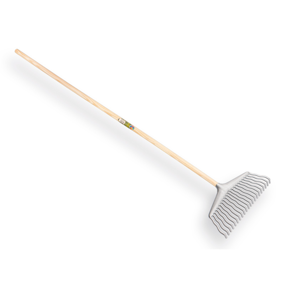 Voor grote vlakken is een brede waaierhark van circa 50–53 cm met 24–27 tanden efficiënt; voor borders werkt een smaller of stalen model preciezer.
